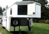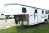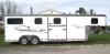 EXTERIOR: Aluminum on light weight preformed galvanized frame, aerodynamic V nose, no rivets on side panels, 3 exterior ties, reinforced fiberglass roof- self insulating, fiberglass fenders, outside light switch for interior horse area lights and load lights, large horse area windows with screens and sliders, side curtain with sliding window/screen/and bars (above ditch side ramp) emergency
